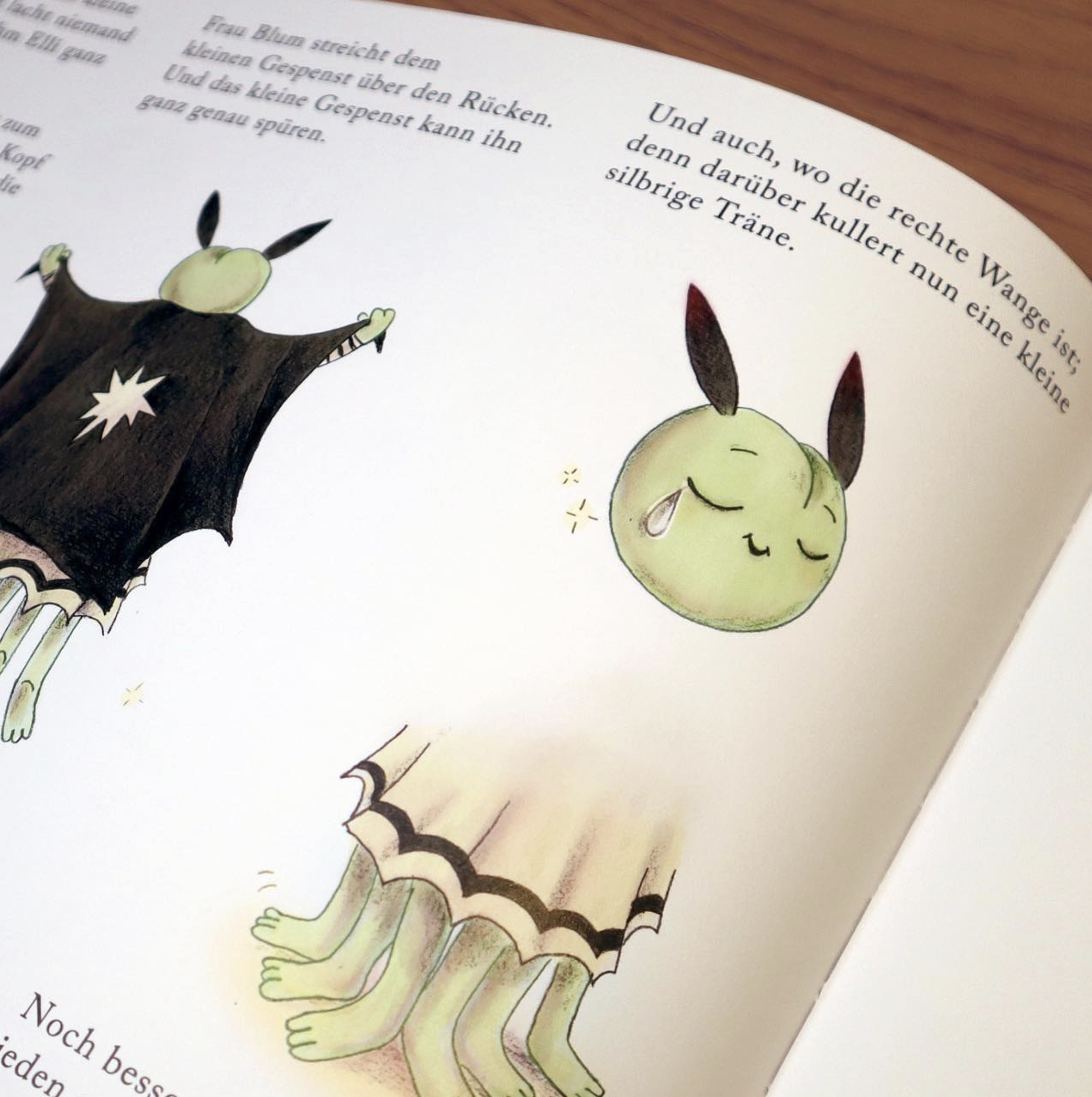 Es klingt, als wären Geister im Haus. Dabei will das kleine Gespenst niemandem Angst einjagen. Es heult nur, weil es sich überall anstößt. Weil es unsichtbar ist, weiß es ja kaum, wo es anfängt und aufhört.Viele Mieterinnen und Mieter sind schon ausgezogen. Deshalb bangen die Eltern von Elli und Ali um ihre Aufgabe als Hausmeister. Doch heute backen sie Knoblauchbrote. Denen kann das kleine Gespenst nicht widerstehen, auch wenn es danach furchtbar pupsen muss. Ja, es ist unsichtbar, aber jetzt kann man es riechen und orten. Papa legt dem kleinen Gespenst den Arm um die Schulter, Elli streicht ihm über den Kopf, und Ali zählt seine siebzehn Zehen. Langsam kommt die Gestalt des kleinen Gespenstes zum Vorschein, und endlich spürt es, wer es ist.