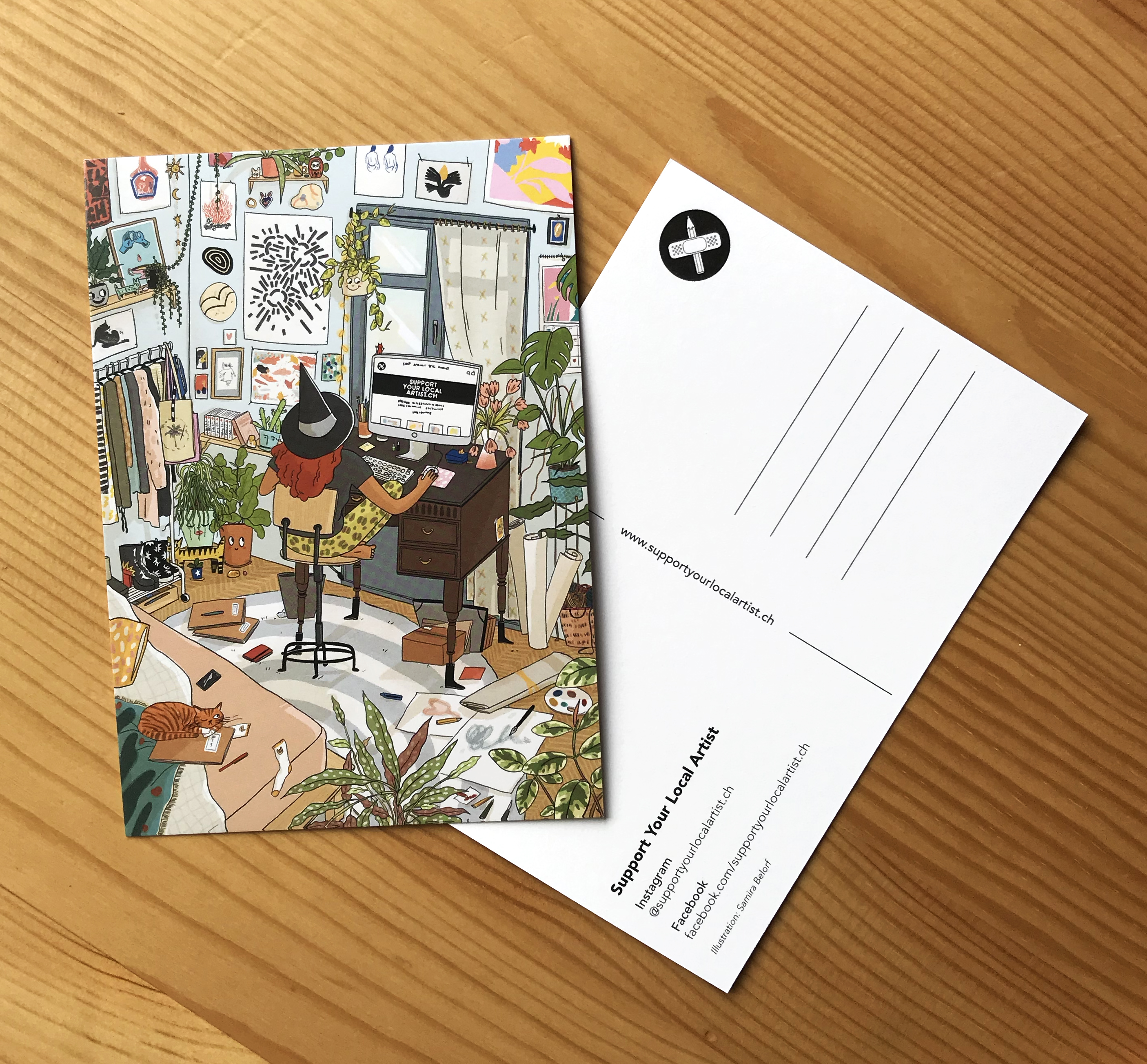 Zwei Illustrationen für die Bewerbung des Onlineshops www.supportyourlocalartist.ch. Support Your Local Artist ist ein Onlineshop für Schweizer Künstler*innen. Die Kunstwerke, welche auf den motiven zu sehen sind, können alle online erworben werden.Visitenpostkarte:
